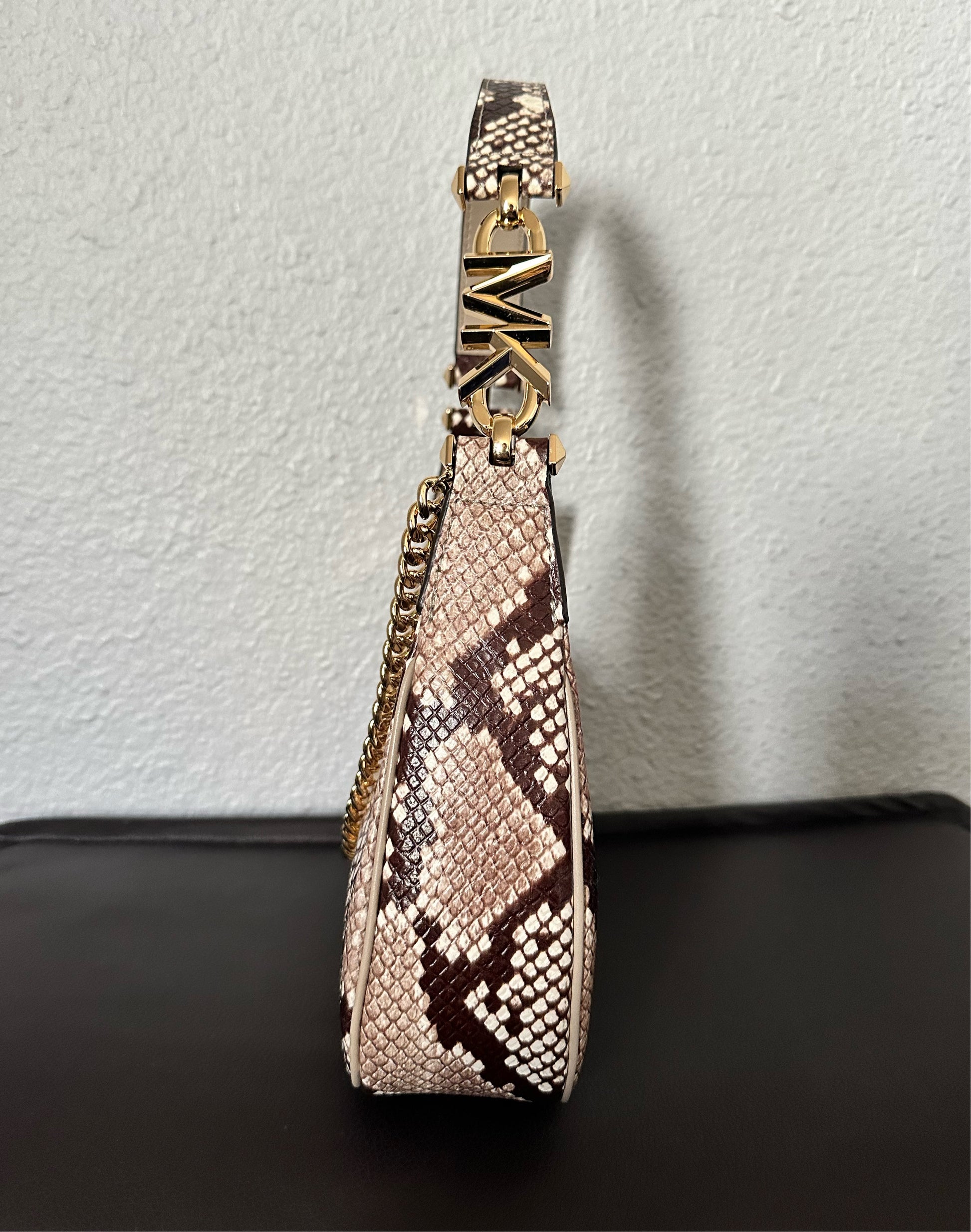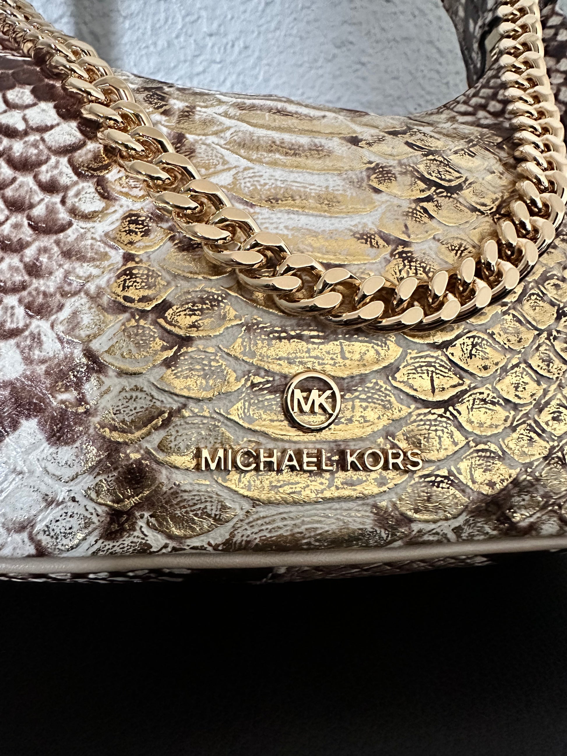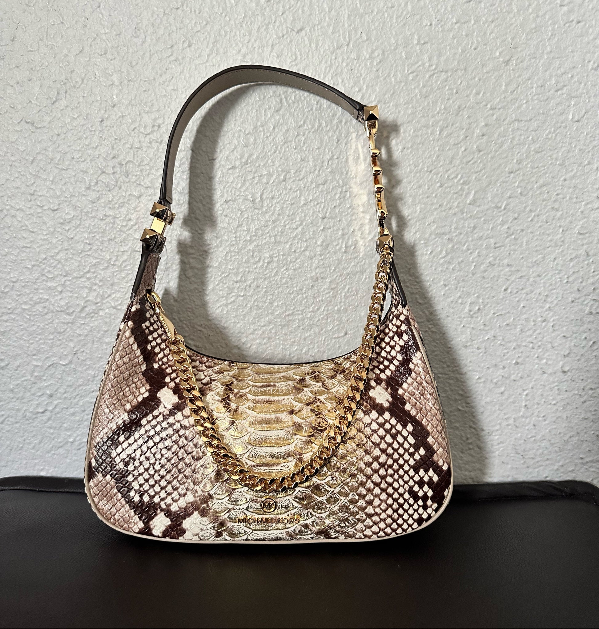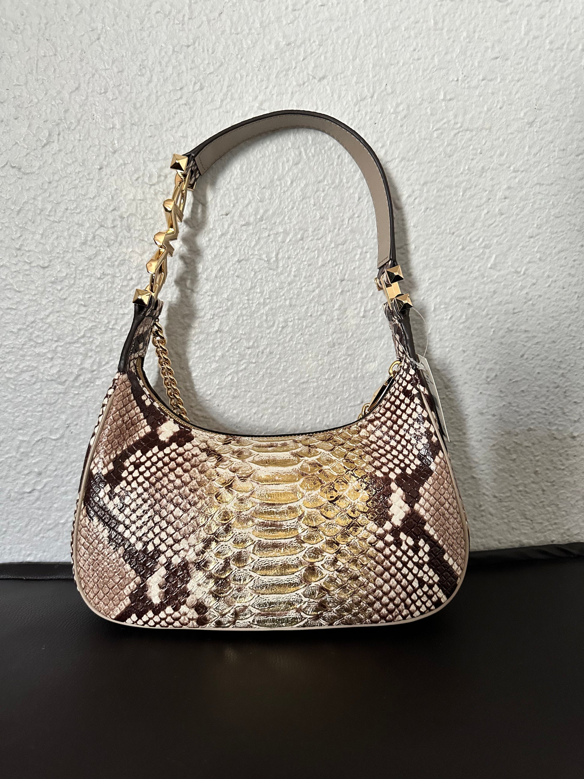Crafted from luxe snake-embossed leather with a striking metallic panel, this PEPPER bag features chain-link hardware and studs that are sure to make a statement. You will love how the shapely top handle will comfortably slip over your shoulder