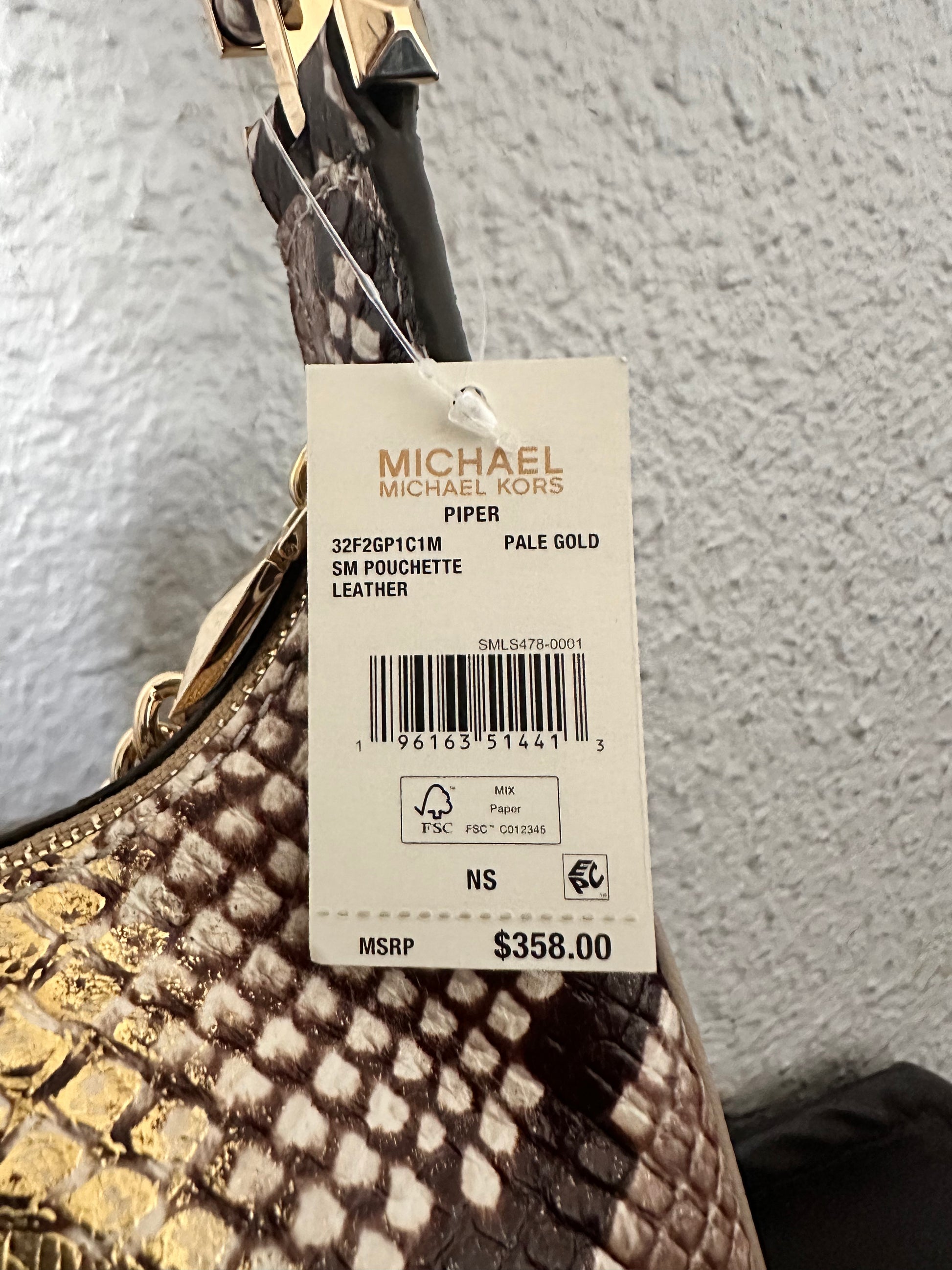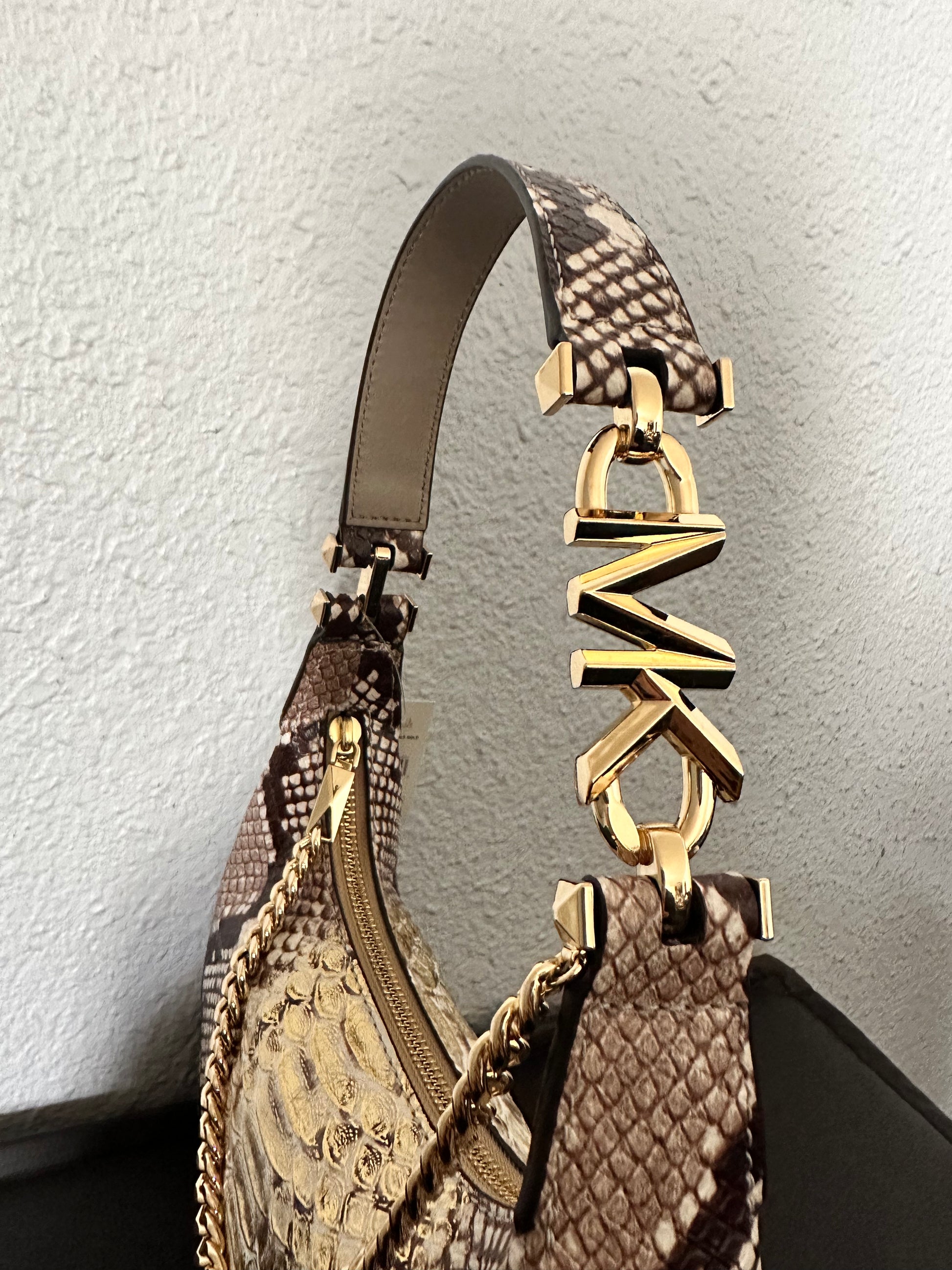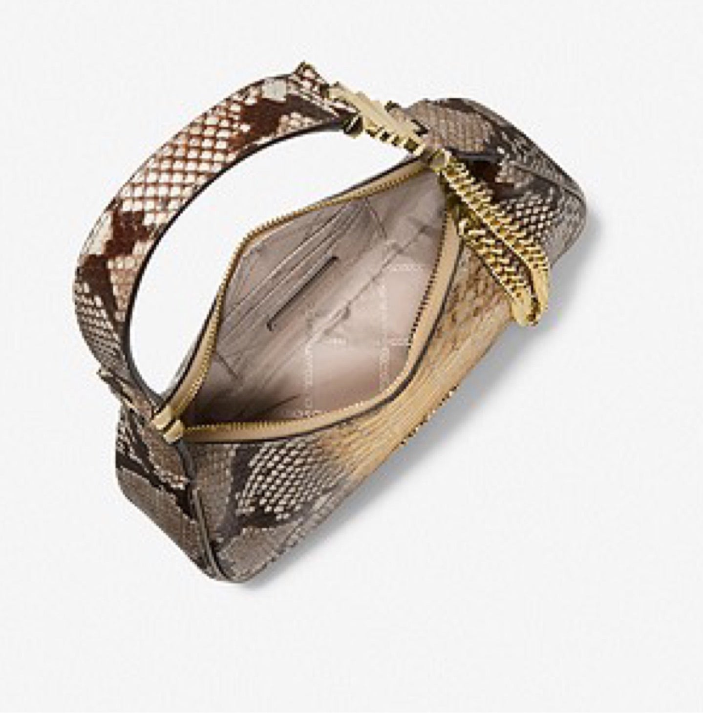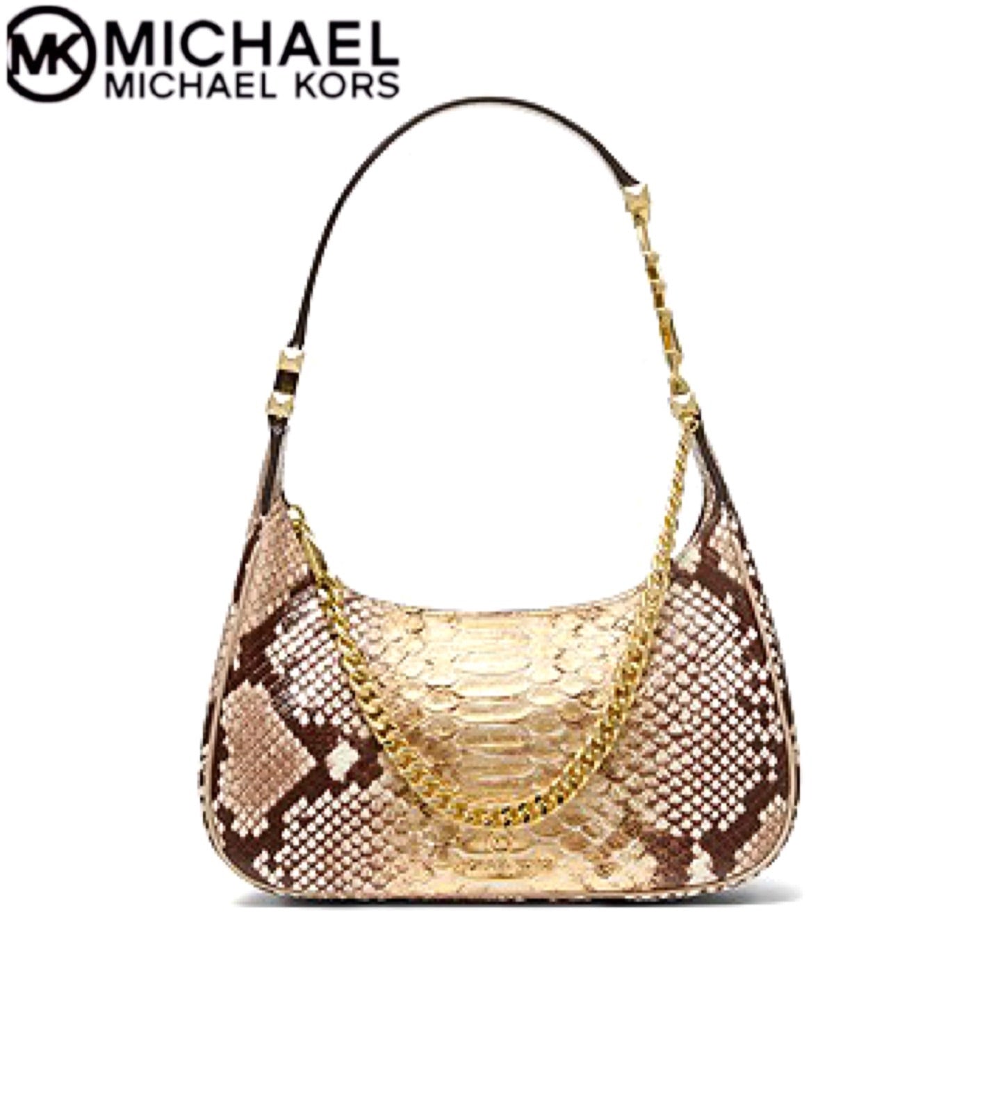 Crafted from luxe snake-embossed leather with a striking metallic panel, this PEPPER bag features chain-link hardware and studs that are sure to make a statement. You will love how the shapely top handle will comfortably slip over your shoulder